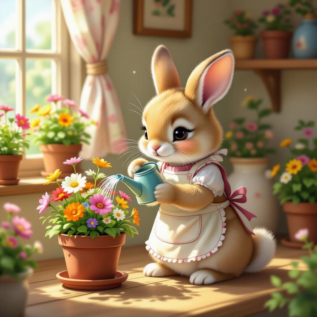 This image shows a magical pet wearing an apron carefully watering a flowering plant inside a cozy cottagecore-style home. The image has a whimsical, pastel aesthetic.