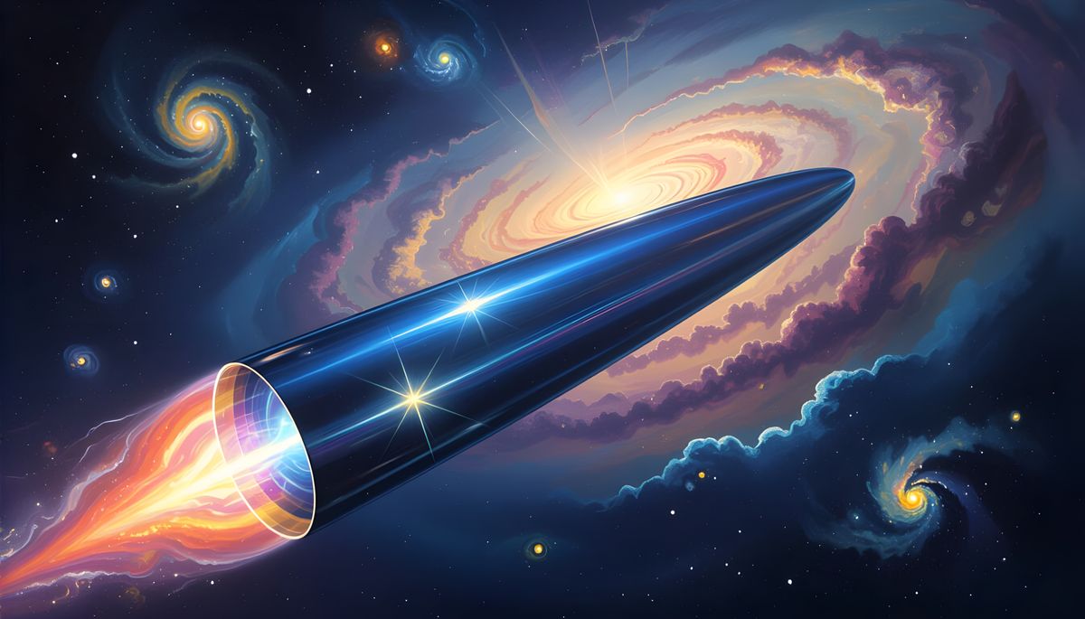 A captivating image of a futuristic, spinning cylinder emitting iridescent plasma. The artwork features a cosmos filled with 3D stars and swirling colors, reminiscent of impasto oil paintings.