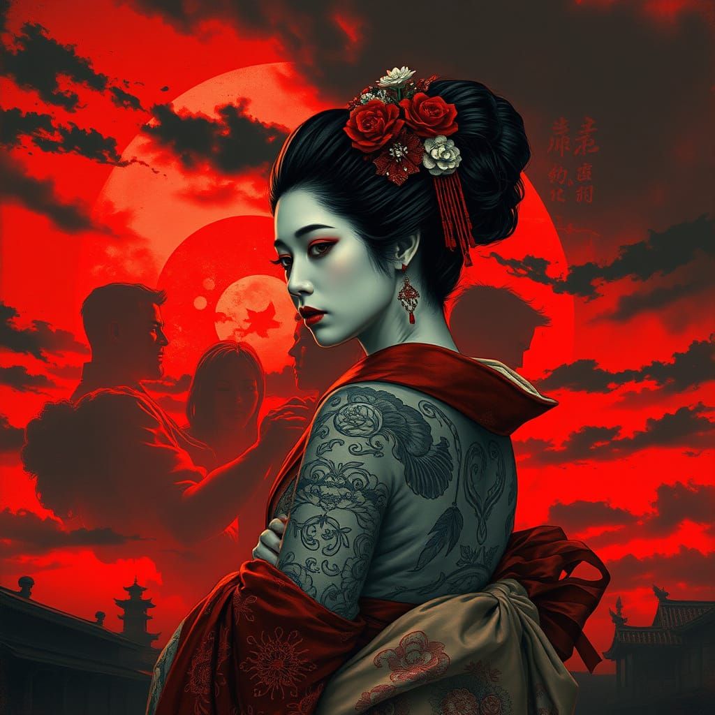 This image shows a geisha with delicate watercolor tattoos, wearing a traditional kimono and obi. The scene features a blood-red summer sky with ominous clouds, rendered in a dark, cinematic horror style.
