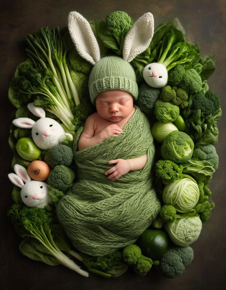 This image shows a peacefully sleeping newborn wearing a bunny hat and green outfit, nestled among fresh green vegetables while cuddling a plush rabbit toy in a soothing, artistic tableau.