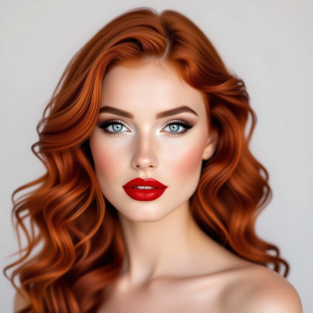 This AI-generated image features a striking Irish woman with vibrant red curly hair, captivating blue eyes, and bold red lipstick and black eyeshadow.