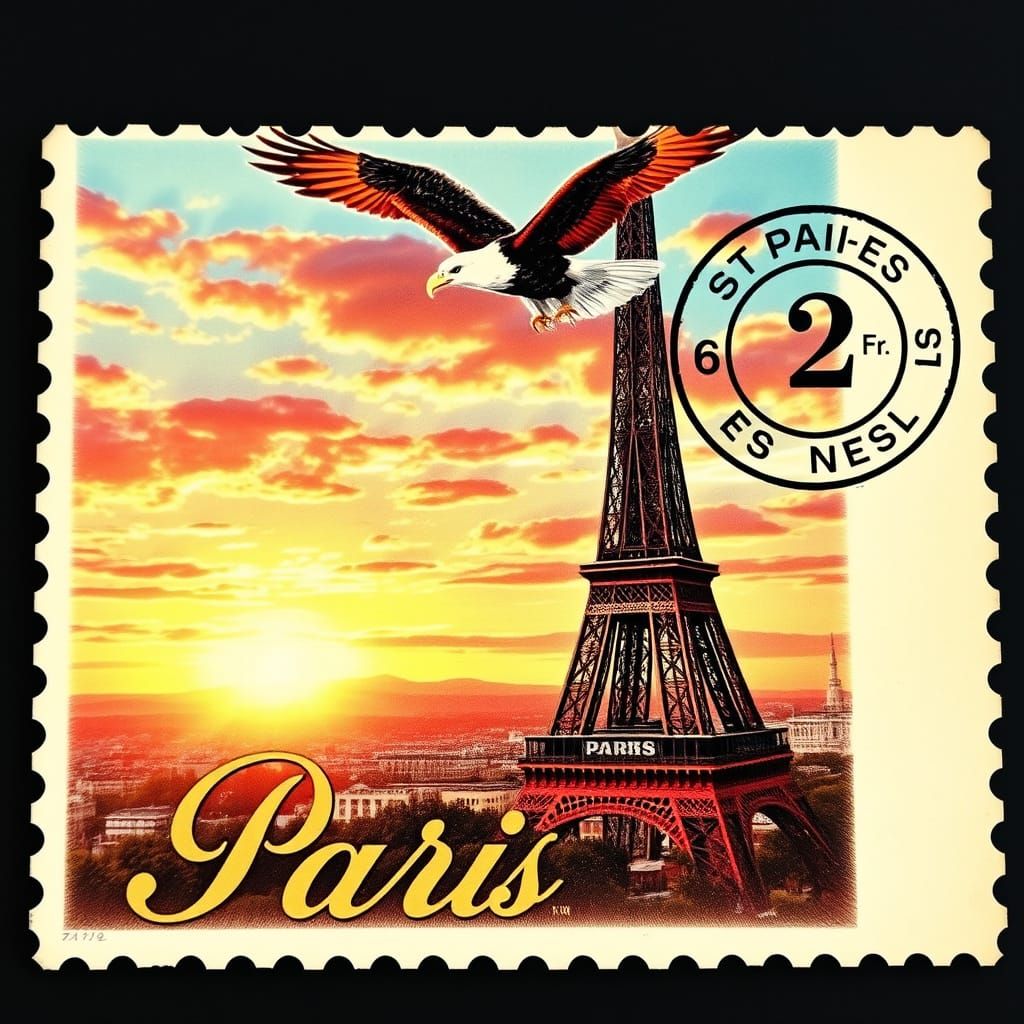 Vintage colored lithographic toothed edge postcard featuring a view of Paris at sunrise, with text "Paris" in italics gold letters in thebottom corner, in the upper right corner a french round postage stamp with text "Paris 2 Frs", a majestic eagle soars over the Eiffel Tower. photography of Ansel Adams ...