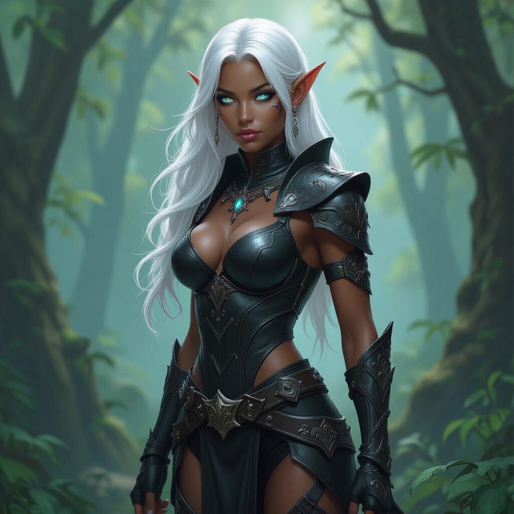 A powerful black-skinned elf warrior with white hair and glowing blue eyes stands in a magical forest. The image features dynamic brushstrokes, futuristic elements, and vibrant colors.