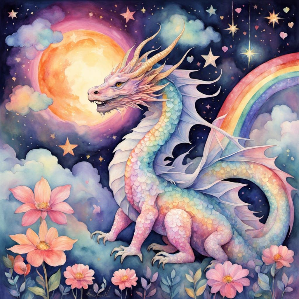 This enchanting image shows a delicate pink eastern dragon amidst a kaleidoscope of swirling rainbows, hearts, and stars, set against a soft, dreamy backdrop of fluffy clouds and stardust. Characterized by whimsical textures and a vibrant, pastel-hued color palette, this artwork embodies a sense of magic...