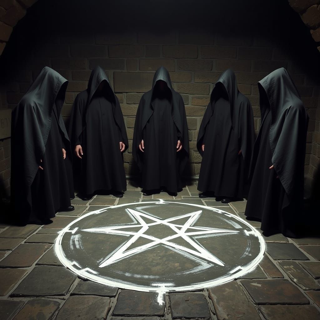 This image shows five priests in hooded cloaks standing around a chalk pentagram in a cellar. The scene evokes a dark, mystical atmosphere reminiscent of surrealist art.