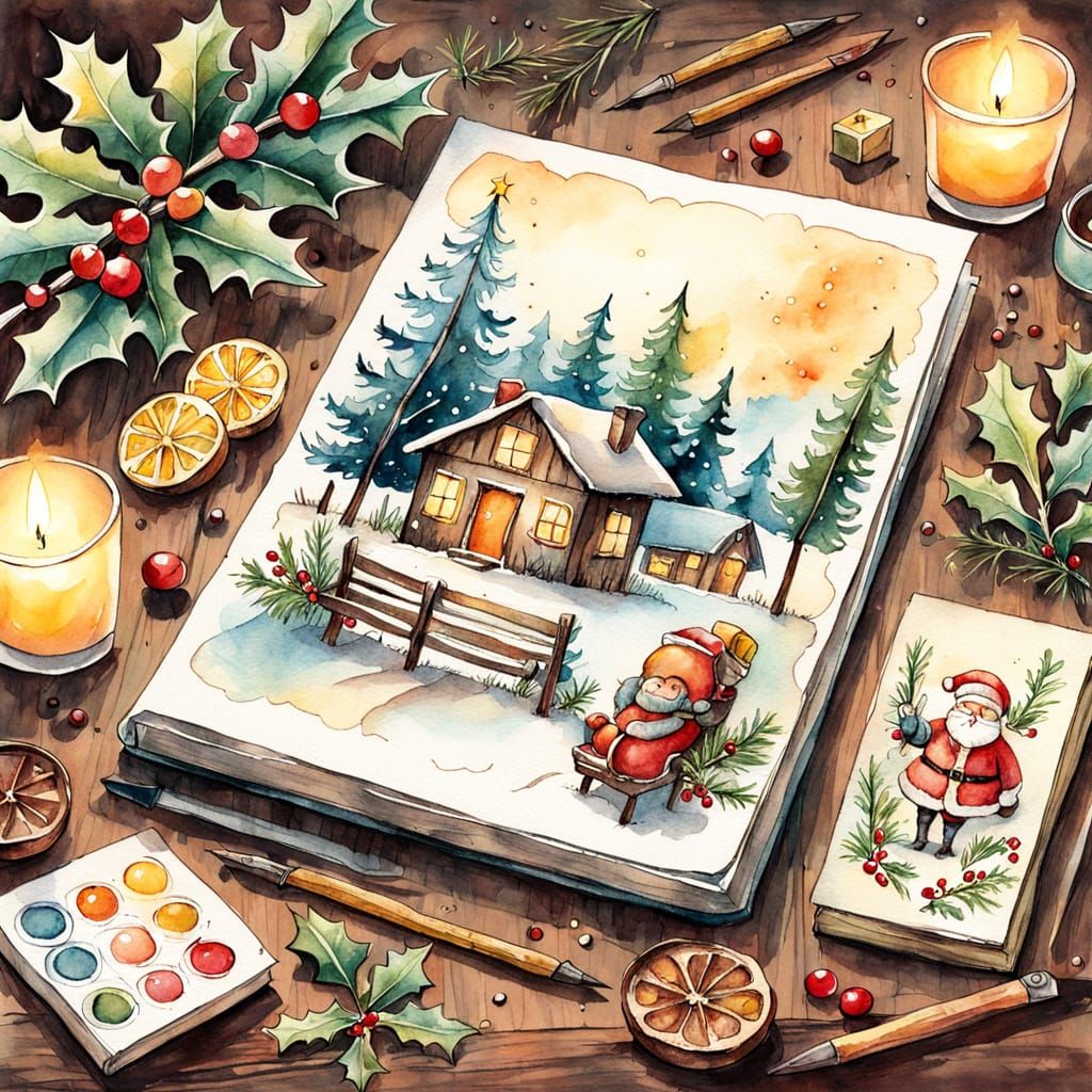 This mixed media artwork features a cozy Christmas scene, blending watercolor sketches with textured collage elements on a vintage table. A festive holly sprig adds detail.