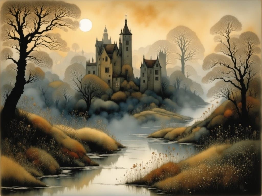 This image depicts a meticulously detailed castle ruin emerging from morning river mist. The artwork features intricate textures and a sense of enchantment, rendered with fine artistic techniques.