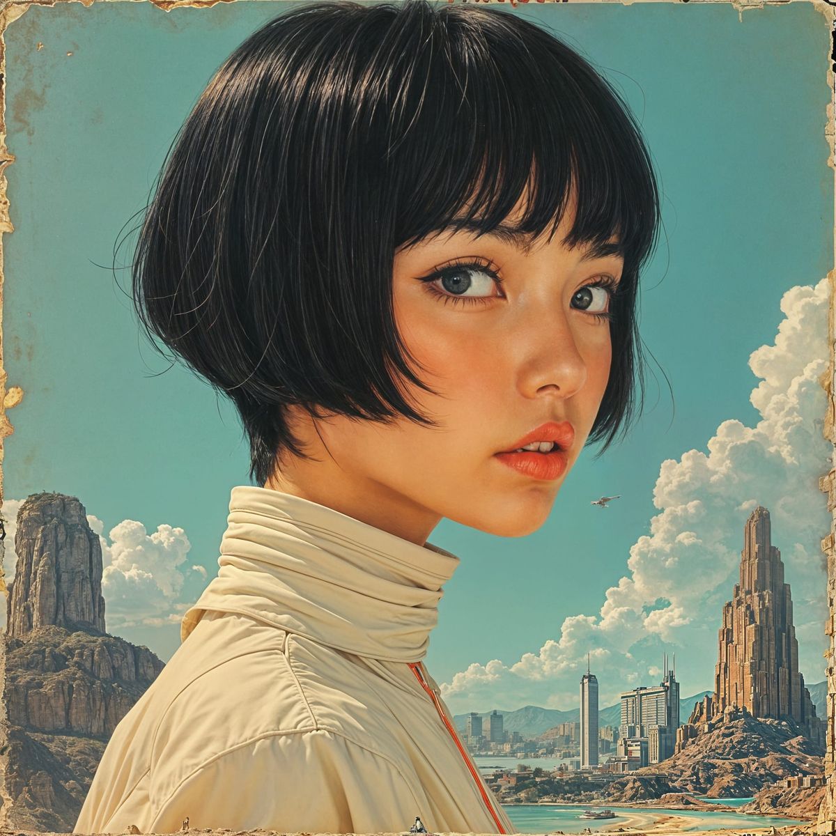 This image shows a vintage-style VHS cover illustration for a science fiction film. It features a Japanese girl in a futuristic astronaut dress, with a cityscape in the background, in the style of 1980s artwork.