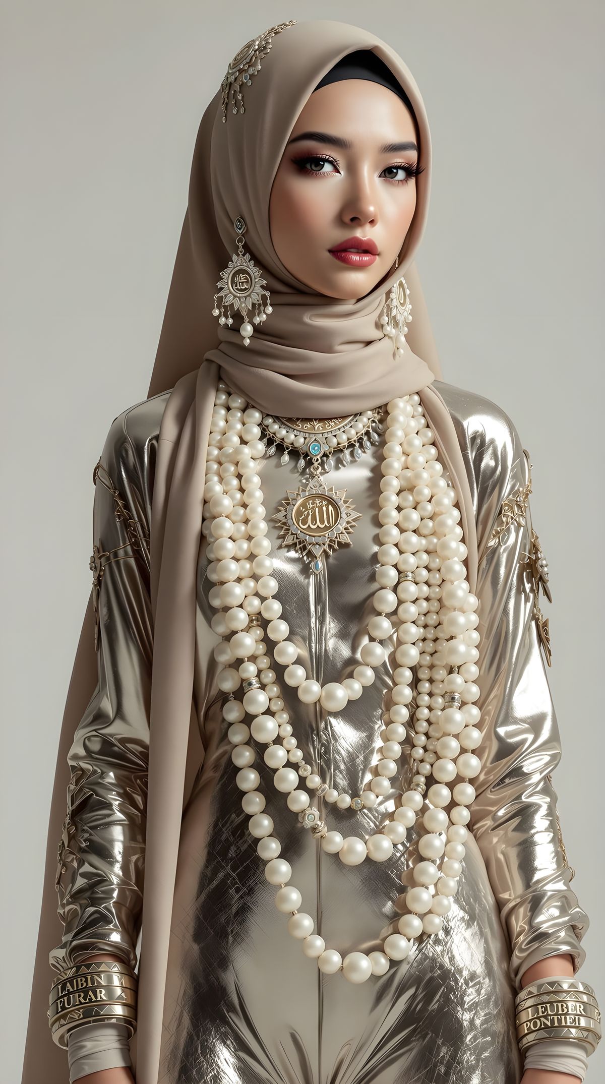 This image features an Asian woman in a shiny metallic jumpsuit, accessorized with a long pearl body chain, Quran necklace, and Arabic earrings, blending modern and traditional Islamic style.