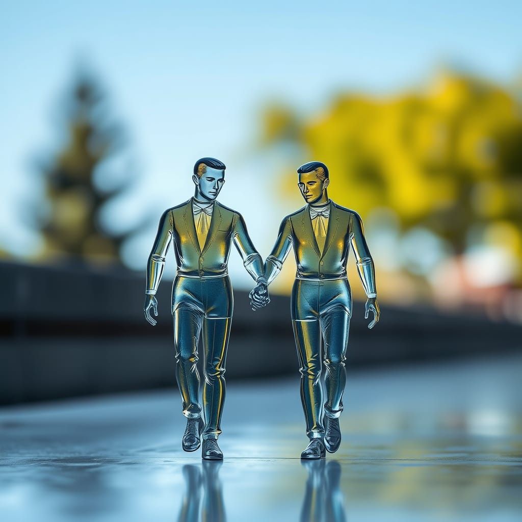 This image shows two men made of transparent glass walking hand in hand. The photograph features bokeh, natural lighting and sharp focus, captured with a Canon lens.