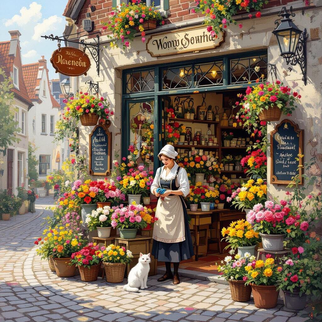 A charming flower shop nestled in a quaint European village, complete with cobblestone streets and a white cat. The scene is painted with soft brushstrokes and warm lighting.