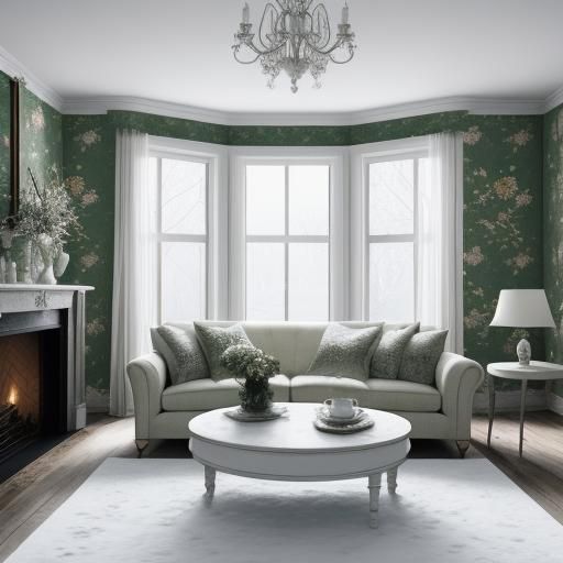 This image shows a luxurious white living room with green floral wallpaper, a vintage sofa, and a fireplace. Soft focus and natural light highlight the elegant, magazine-worthy interior on a snowy day.