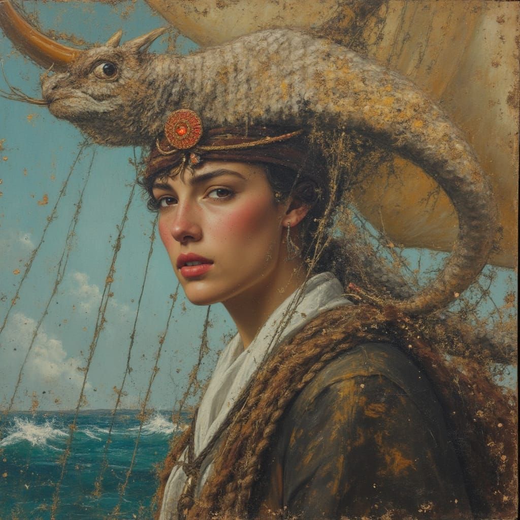 This image shows a close-up action portrait of a Utraean woman sailor navigator at sea, created in a unique blend of traditional and contemporary techniques, featuring intricate details and an otherworldly atmosphere.