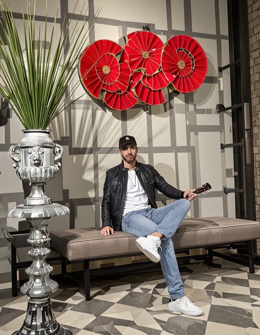 A man in a leather jacket plays guitar on stage. The scene is dimly lit with a spotlight, rendered with vibrant colors and dynamic composition, in a moody and atmospheric style.