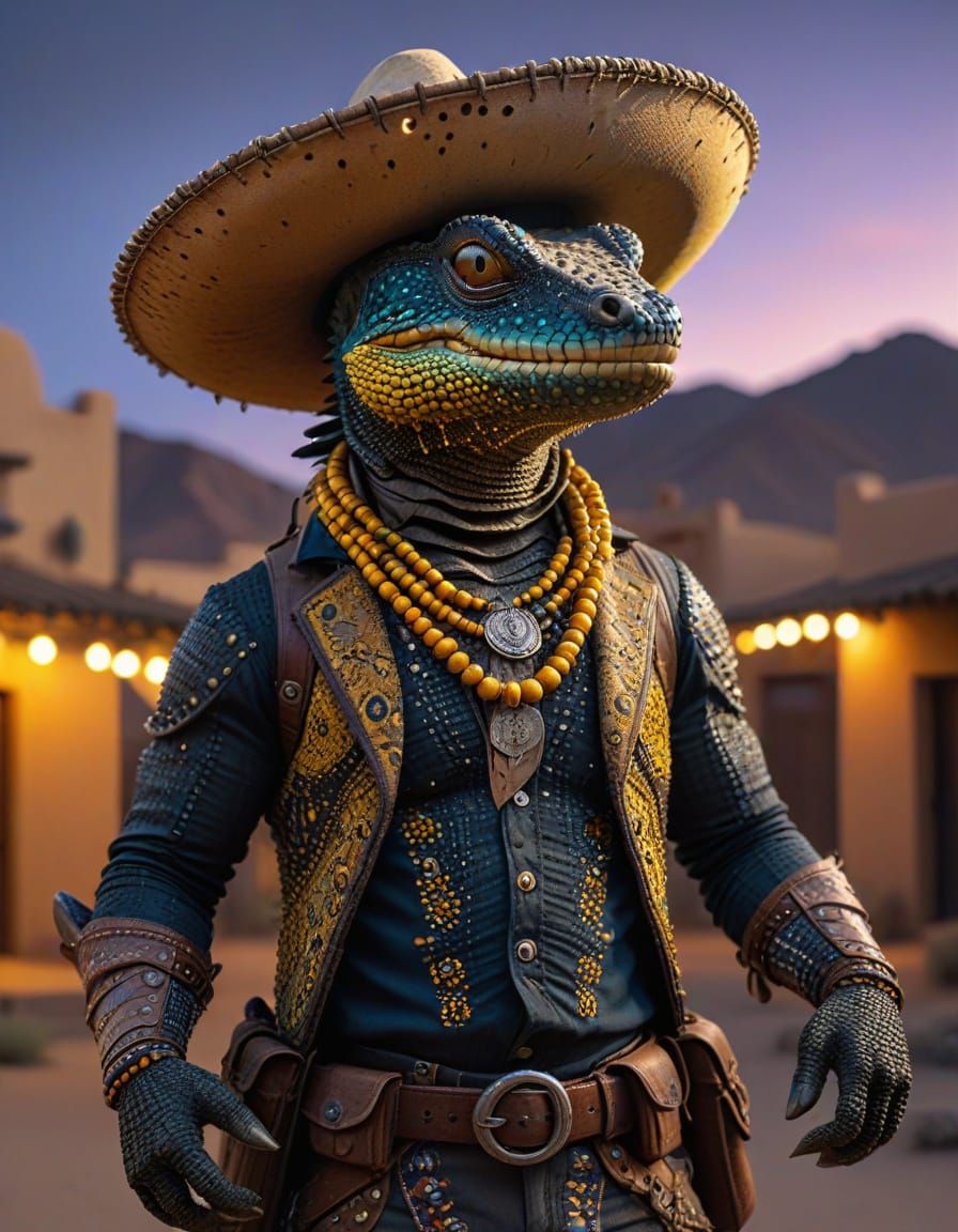 A vibrant image of a beaded lizard bandit in a sombrero, holding pistols and wearing bandoliers. The illustration features bold character design and dramatic lighting in a gritty, textured style.