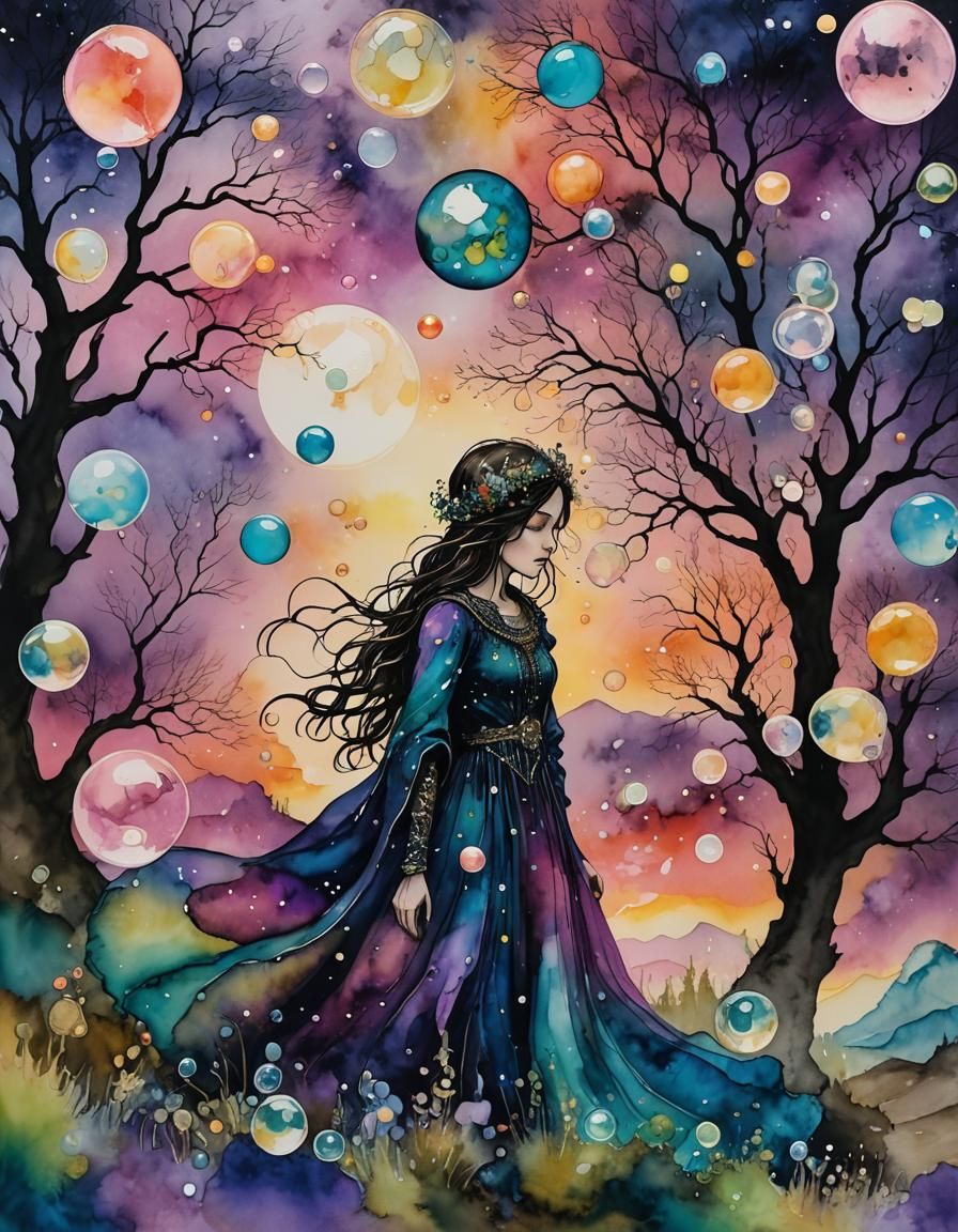 This image shows an otherworldly landscape with an enchantress summoning spirit bubbles at twilight, rendered with vibrant alcohol ink techniques.
