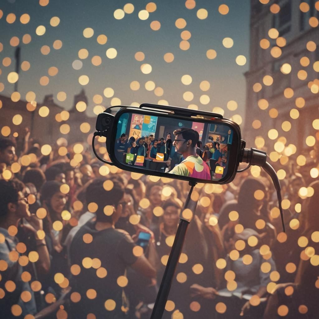This image shows a university ambassador announcing a contest across social media and in-person. The scene, rendered as vibrant digital art, features bold shapes, modern tech, and a brightly colored logo, all set against a detailed university backdrop.
