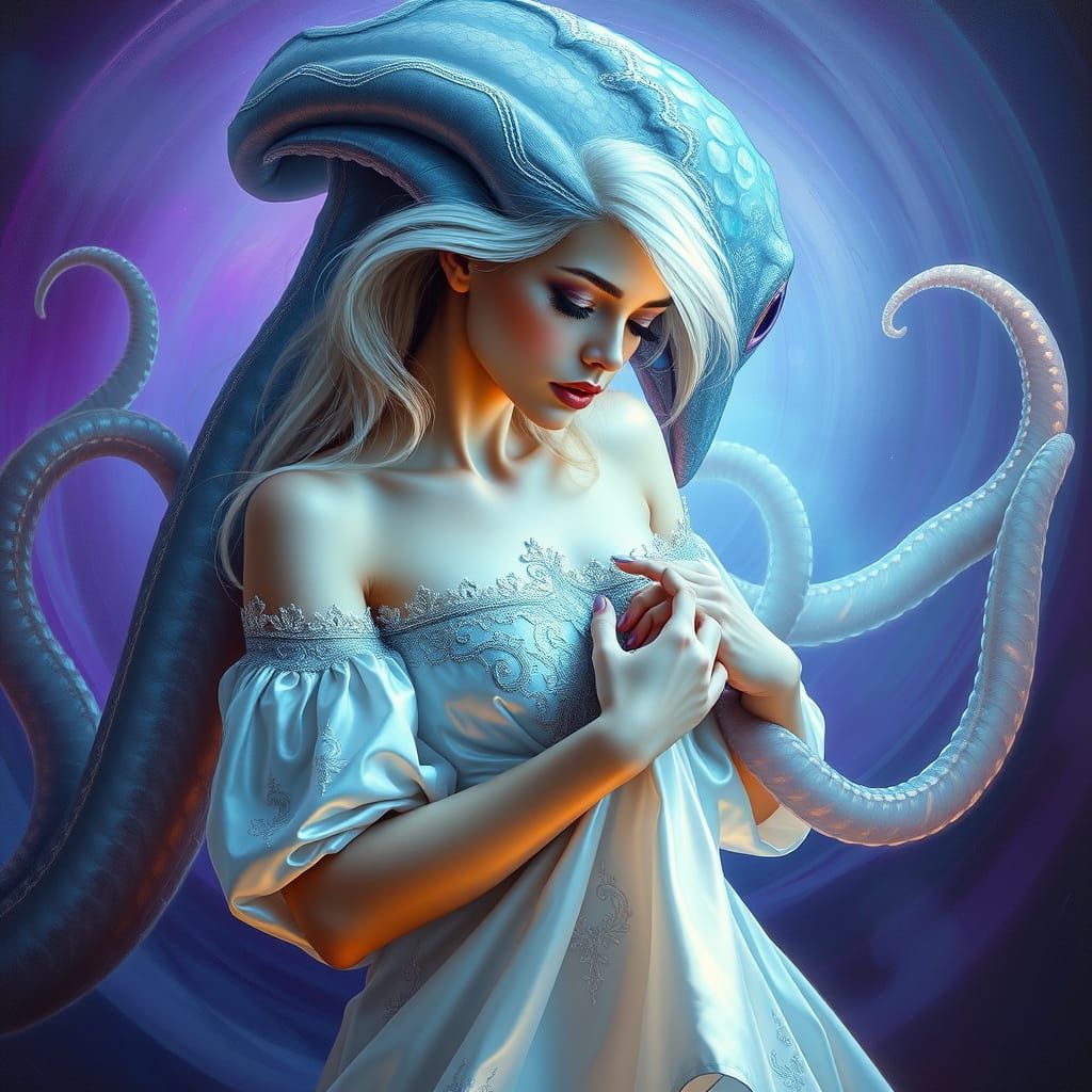 This image shows a platinum blonde woman in a flowing gown, cradled by a majestic alien creature with shimmering eyes. Soft lighting and vibrant colors evoke a sense of wonder and depth, blending futuristic and dreamlike qualities.