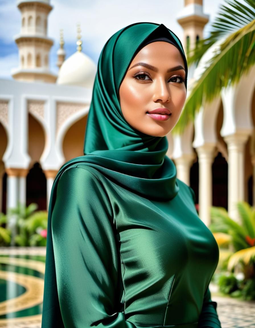 This image shows a beautiful young Indonesian woman in a dark green satin dress and hijab. She is standing in a tropical open-air mosque courtyard surrounded by colorful flowers, captured in photorealistic style.