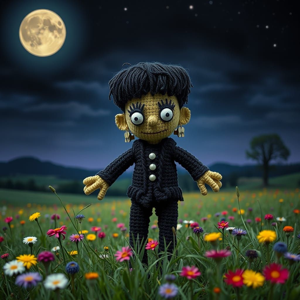 This image is a whimsical Tim Burton-inspired scene of a Frankenstein doll surrounded by a macrame web, set against a psychedelic country meadow landscape at dusk
