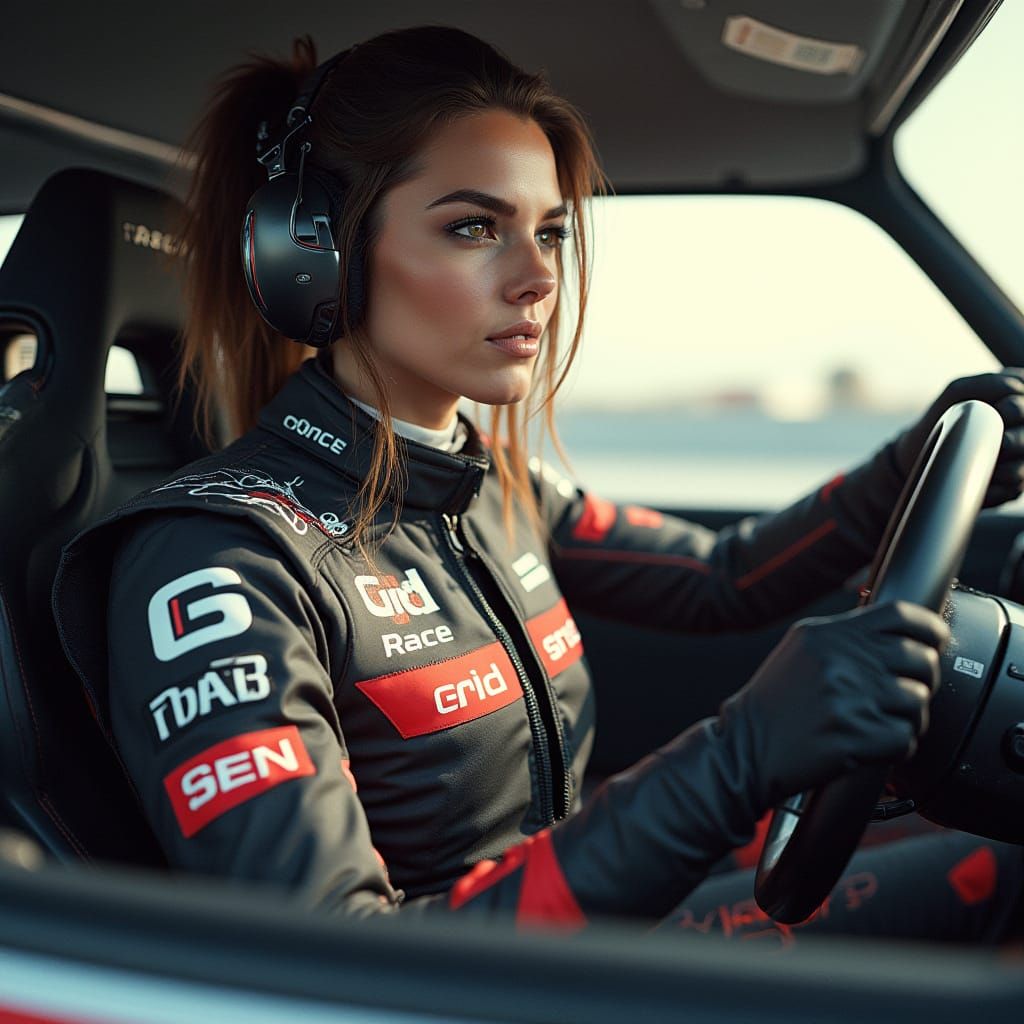This image shows a young female race car driver in a GT3 car. She's wearing a racing suit with "Grid Race" on it, rendered with a futuristic, high-tech aesthetic.