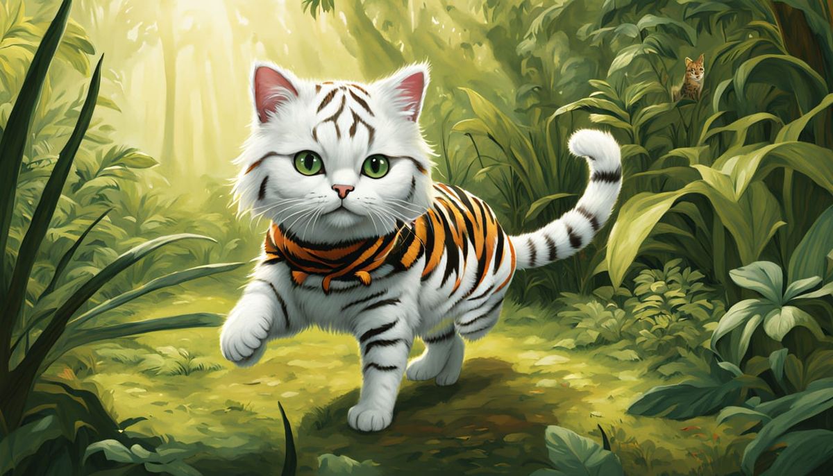 This whimsical fantasy illustration shows an adorable white cat in a detailed miniature tiger costume. The cat prowls through a lush jungle with dappled sunlight.