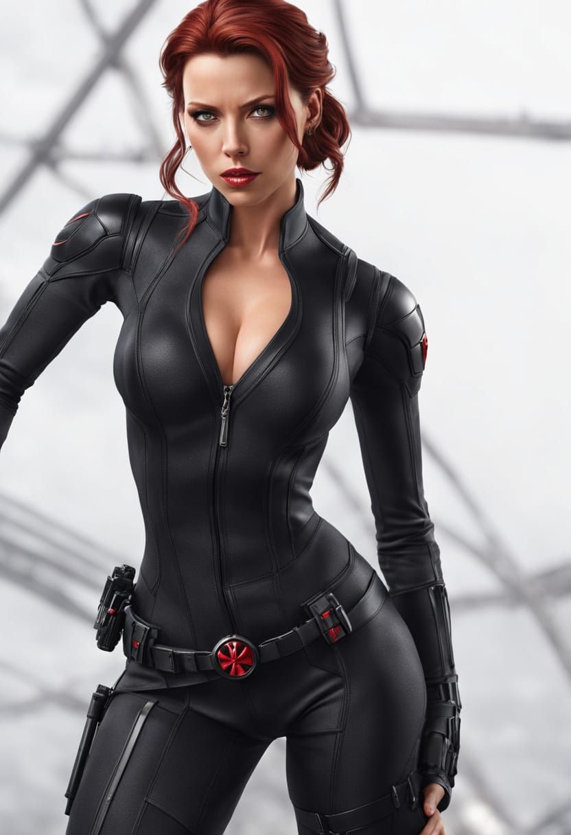A stunning, ultrarealistic portrait of Marvel's Black Widow, showcasing her beautiful face, long red hair, and sensual Black Widow outfit.