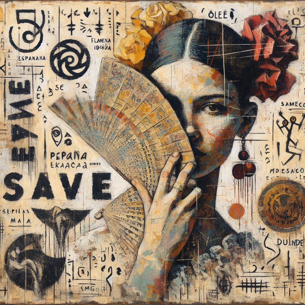 A post-impressionistic painting illustrating a close-up of a female flamenco dancer's face from a 3/4 angle. She is wearing a flamenco hat and her hands are playing castanets intertwined with a fan. The image includes primitive symbols and fragmented text — words like ‘Save’, ‘Flamenco’, ‘Olé, 'España', ...