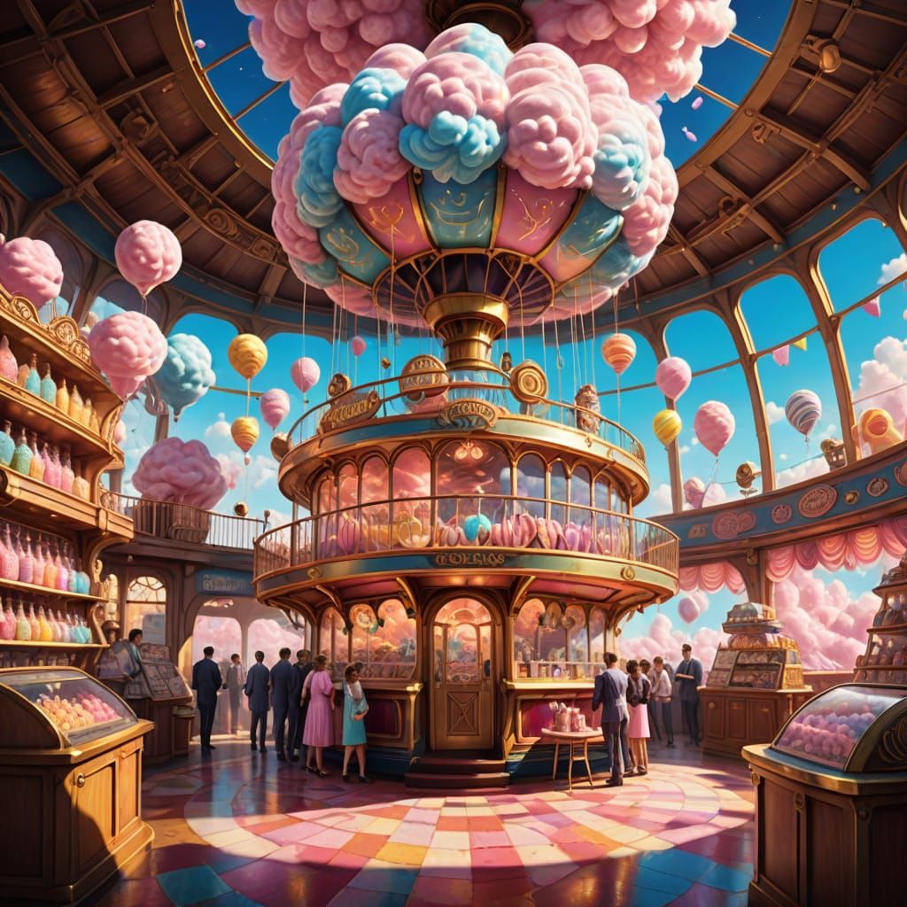 This image shows a fantastical cotton candy shop floating on an airship, reminiscent of a vintage advertisement. The scene is rendered with vibrant colors, dramatic lighting, and incredible detail, as 3D digital art.