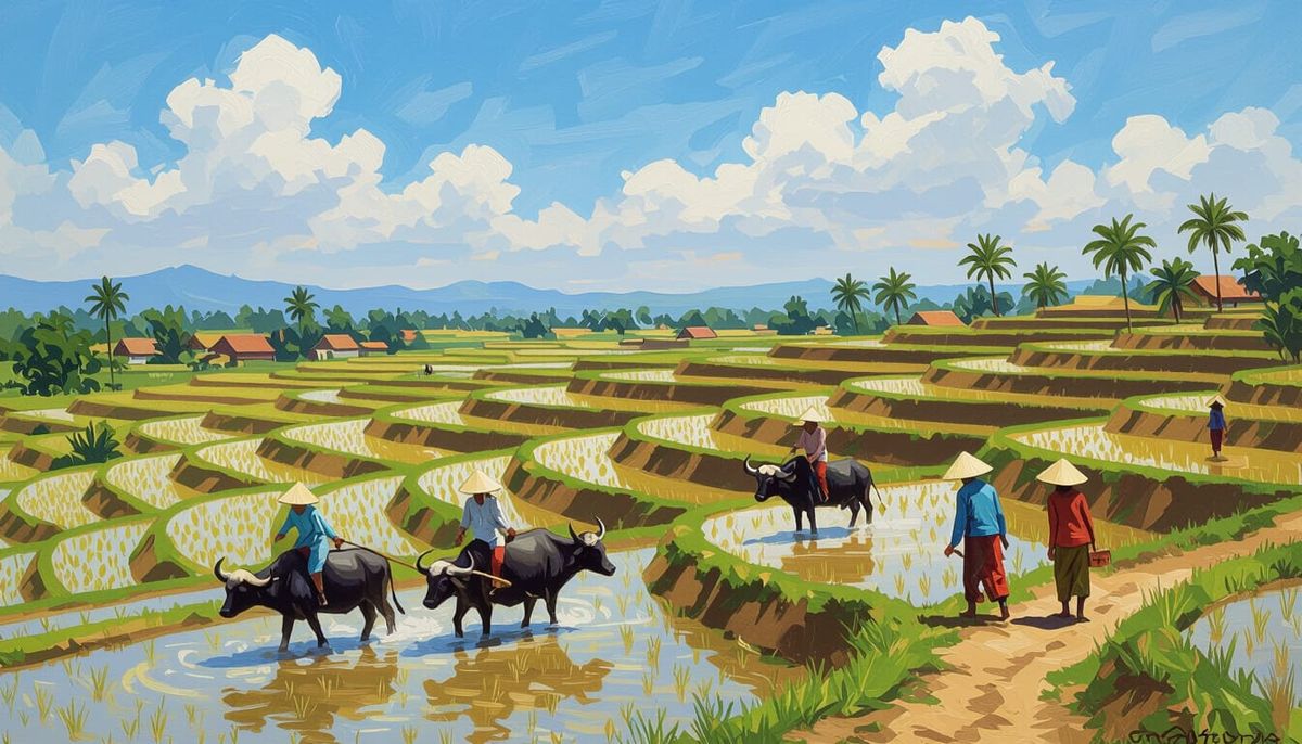 This image shows an ancient farming village featuring terraced rice fields and farmers in conical hats plowing with water buffalo. The scene is rendered with vibrant, earthy tones in an impressionistic style.