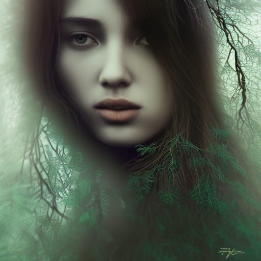 A striking picture of a woman with hair made of tree leaves, rendered with dynamic lighting and intricate detail. The image features deep colors and a photorealistic, airbrushed style.