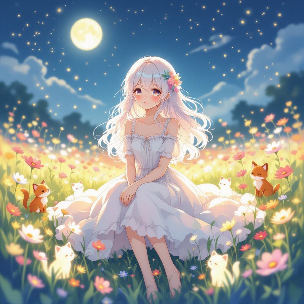 This image shows a serene girl in a lace dress sitting in a field of glowing flowers under moonlight. The artwork features delicate watercolor textures and a dreamy, ethereal aesthetic.