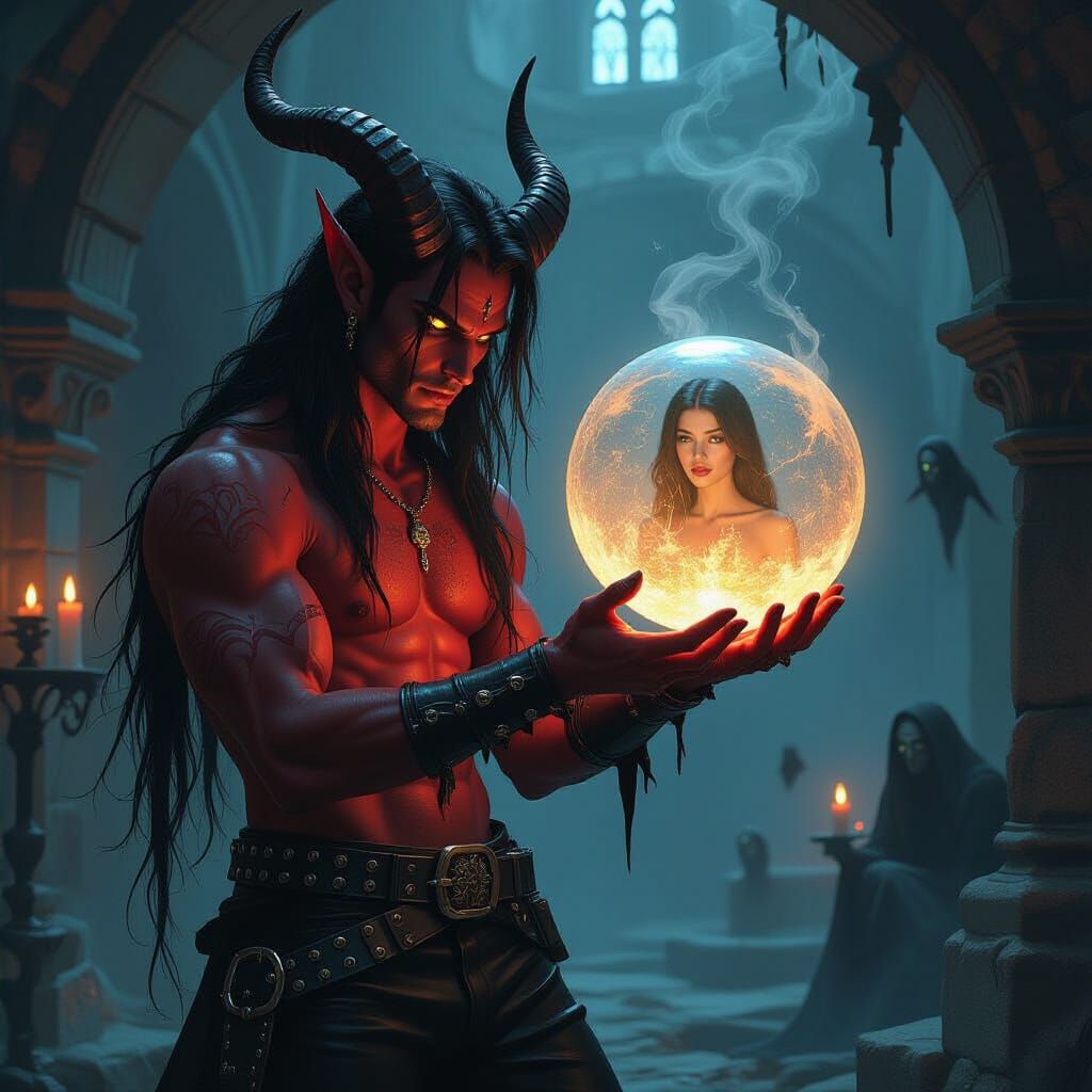 This image shows a striking demon in a dark crypt, gazing into a crystal ball. Ethereal ghouls float around the scene, which is rendered with dark, gothic, and mystical undertones.