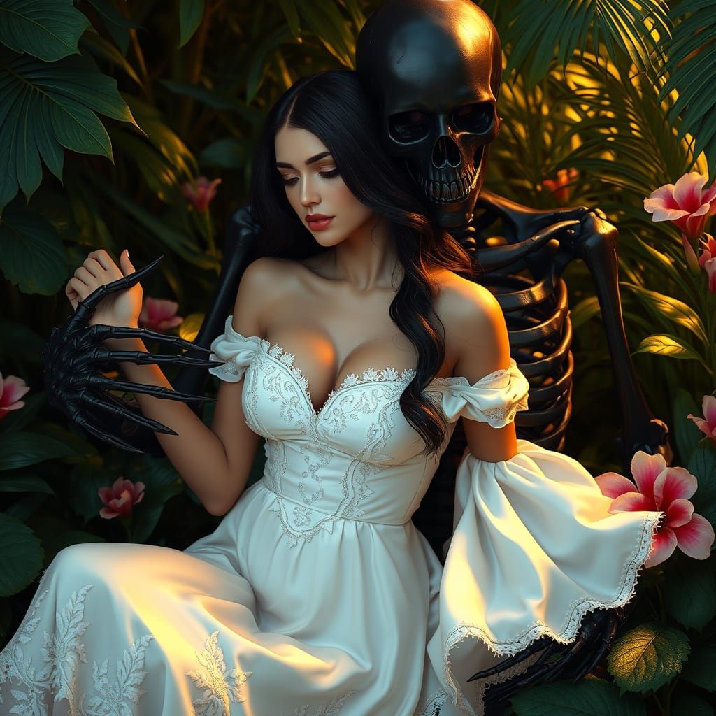 This image captures a breathtakingly beautiful woman in a flowing white dress, cradled by a mysterious skeletal figure amidst a lush jungle scene, evoking a romantic and sensual atmosphere with a touch of dark fantasy.