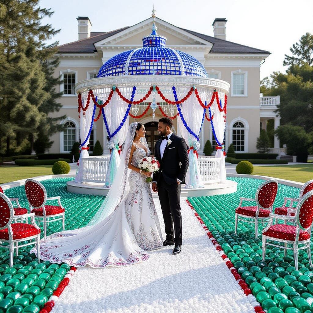 This image showcases a hyperrealistic mansion built from crystal beads, featuring a green bead yard and a white bead carpet. A couple in matching beaded attire stands near a gazebo, all rendered in a luminous, jewel-toned art style.