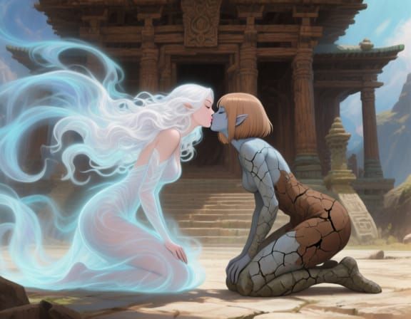 This anime-style key visual depicts translucent air spirit kissing a stone-skinned earth spirit before a majestic temple, with pastel blues and earthy browns.