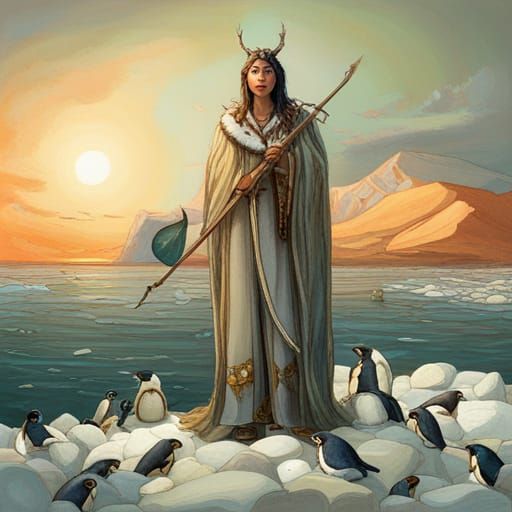 This image shows a penguin goddess with a narwhal horn spear and polar bear fur cloak, standing atop a pile of pebbles and pearls as penguin men present more offerings.