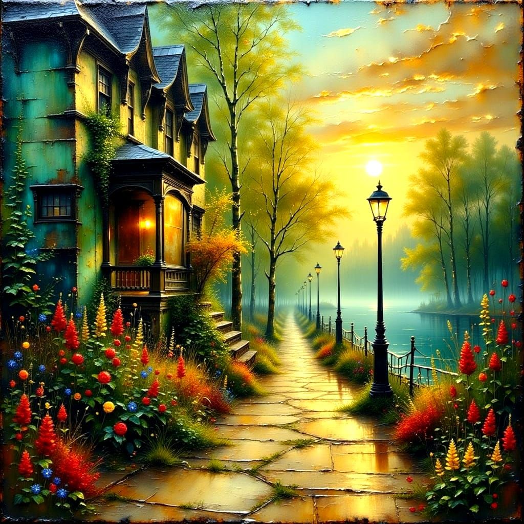 This poignant landscape painting captures a serene yet melancholic scene of an empty garden at twilight. The artist's use of textured impasto oil glaze and vivid colors evokes a sense of nostalgia and loss. The once-thriving garden now lies barren, a testament to the transience of life and the beauty of ...
