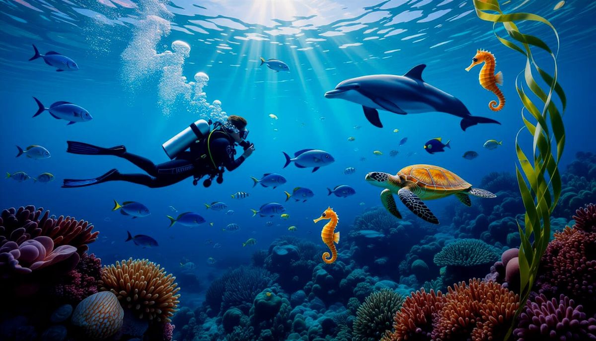 This hyper-realistic image shows a scuba diver exploring a vibrant coral reef teeming with colorful tropical fish, sea turtles, dolphins, and shells on the ocean floor.