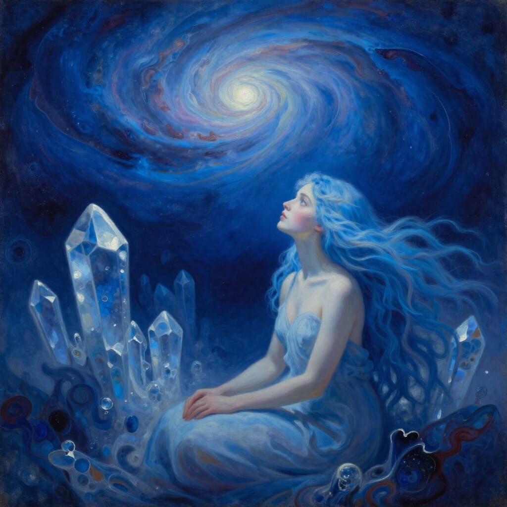 An oil painting in a surrealist style featuring a serene young woman with blue hair gazing at a swirling nebula. Abstract crystalline structures and soft blue light create a sense of infinite calm and wonder.