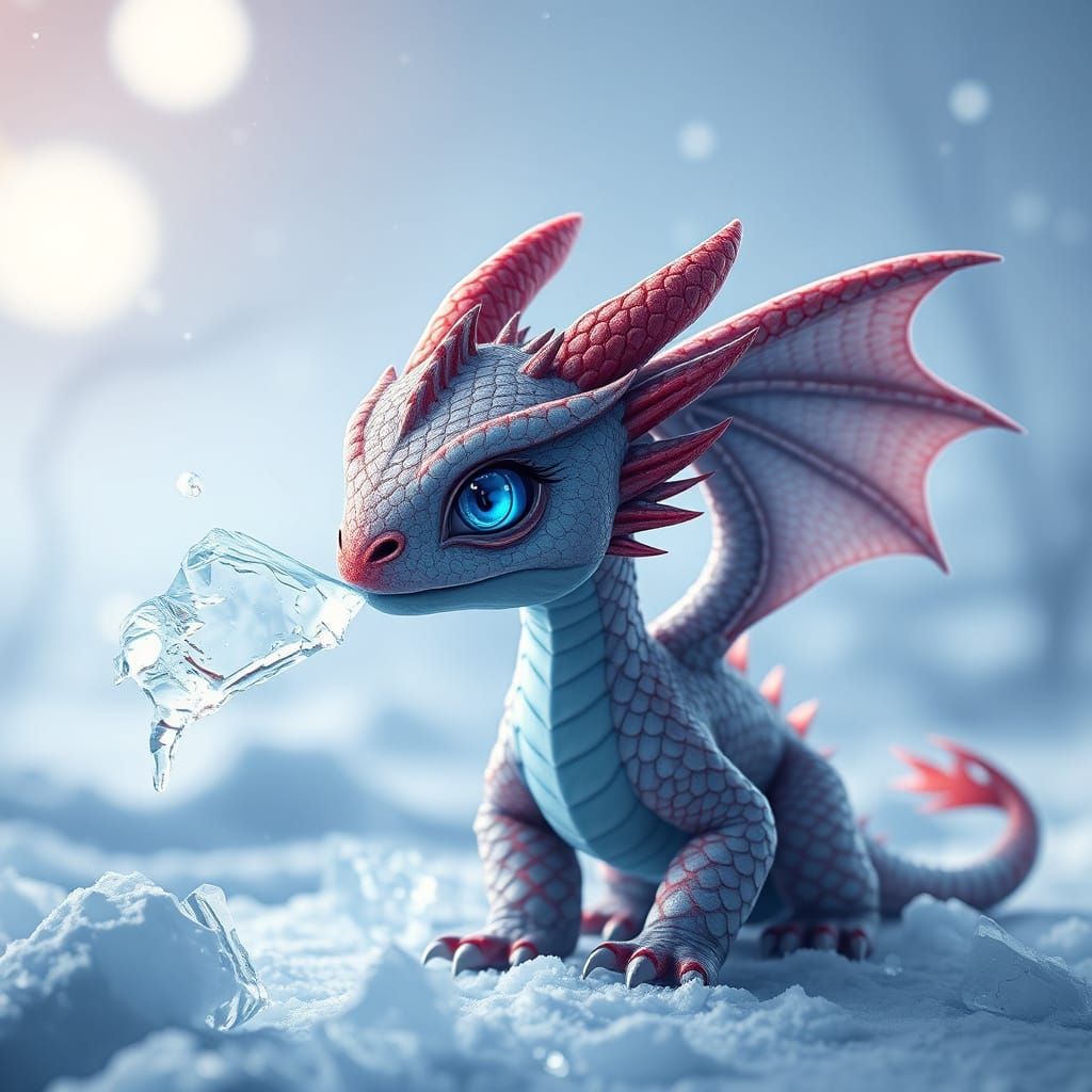 This image shows a photorealistic baby dragon with glowing eyes breathing ice in a detailed winter landscape. Cinematic lighting and high detail create an ethereal, moonlit scene.
