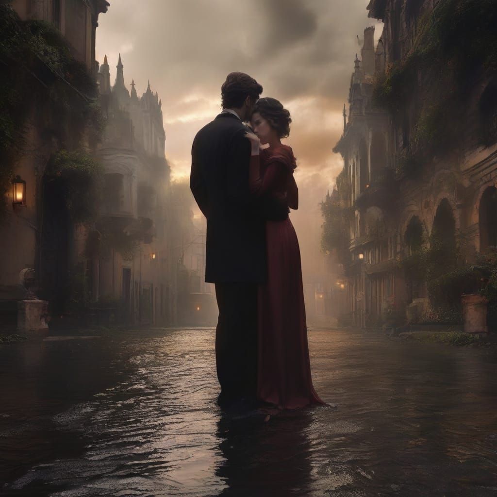 This maximalist digital matte painting depicts a dramatic and atmospheric scene of dark love between a man and a woman, featuring intricate details and cinematic brilliance.