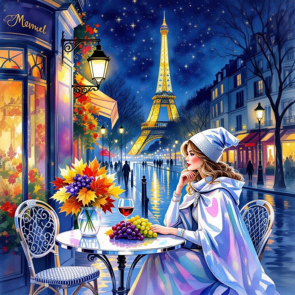 A luminous watercolor painting depicts a girl in a silver cloak at a night cafe. Lantern light illuminates a silver table with wine and leaves, set against an autumn street with the Eiffel Tower.