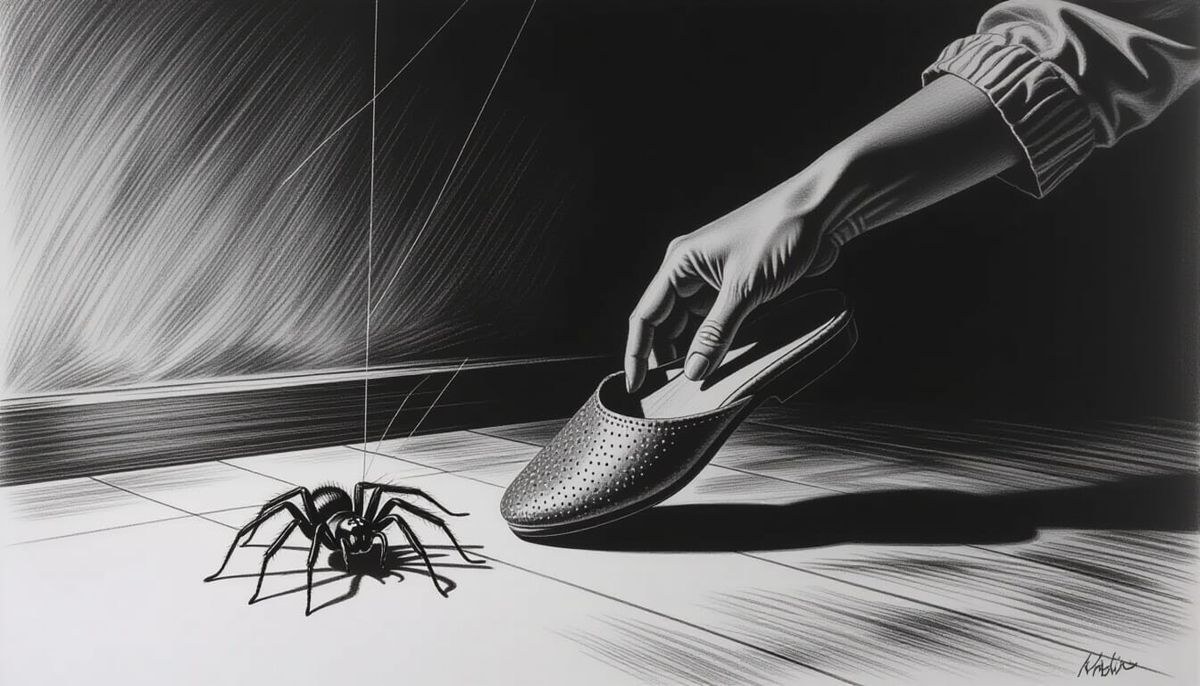 This image depicts a woman about to strike a spider that is no longer there. Rendered in a hyperdetailed charcoal style with dramatic lighting, it captures a moment of tension and illusion.