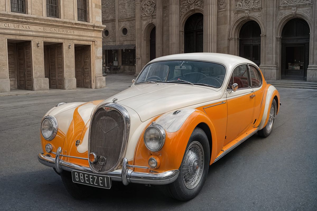 A striking picture of a vintage luxury fastback limousine in white and orange. This image captures a retro aesthetic with the sleek lines of a classic car design.