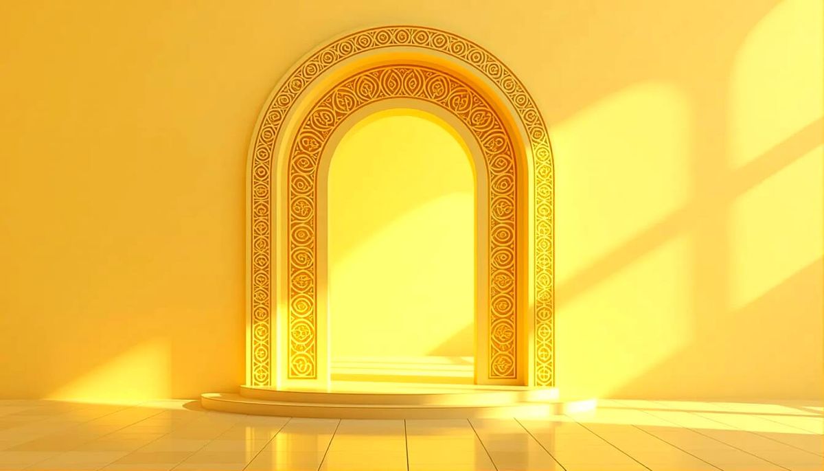 “A single ornate doorway floating in a soft golden-yellow void. The doorway is simplified and symmetrical, inspired by Art Nouveau arches an...