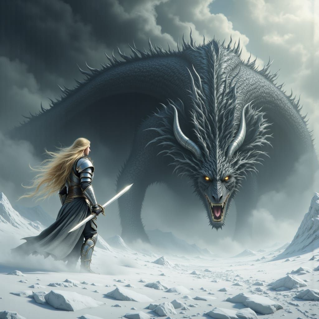 This image shows a valiant young Siegfried in silver armor, his blonde hair flowing as he raises his sword against a colossal dragon. The scene is set on a desolate snowfield with dramatic lighting, reminiscent of gothic art.