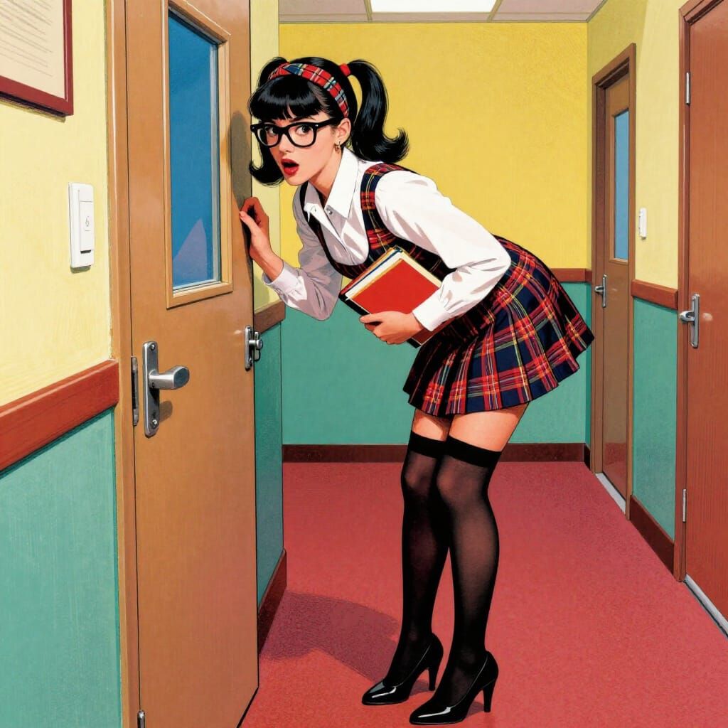 This image depicts a college student with a 1960s mod style, including high ponytails and plaid attire, looking surprised through a small window. Rendered in a vibrant pop art style with bold outlines and saturated colors.