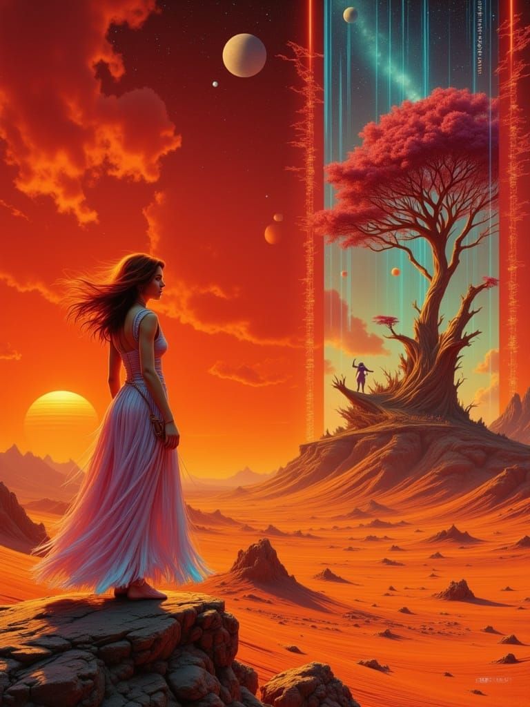 This image depicts a solitary woman with luminous, flowing hair on a red Martian peak, dominated by orange hues. A holographic screen shows an alien in vintage attire beneath a peculiar tree, rendered in a solar punk and futuristic style.