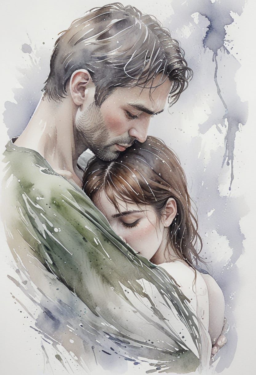 This image shows a man and woman embracing tenderly. It is rendered in a wet-wash watercolor style, with soft, ethereal qualities.